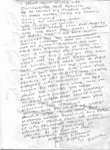 Jim has come to Social Bite for Christmas services and free food for many years. In this letter, he describes what Social Bite means to him.